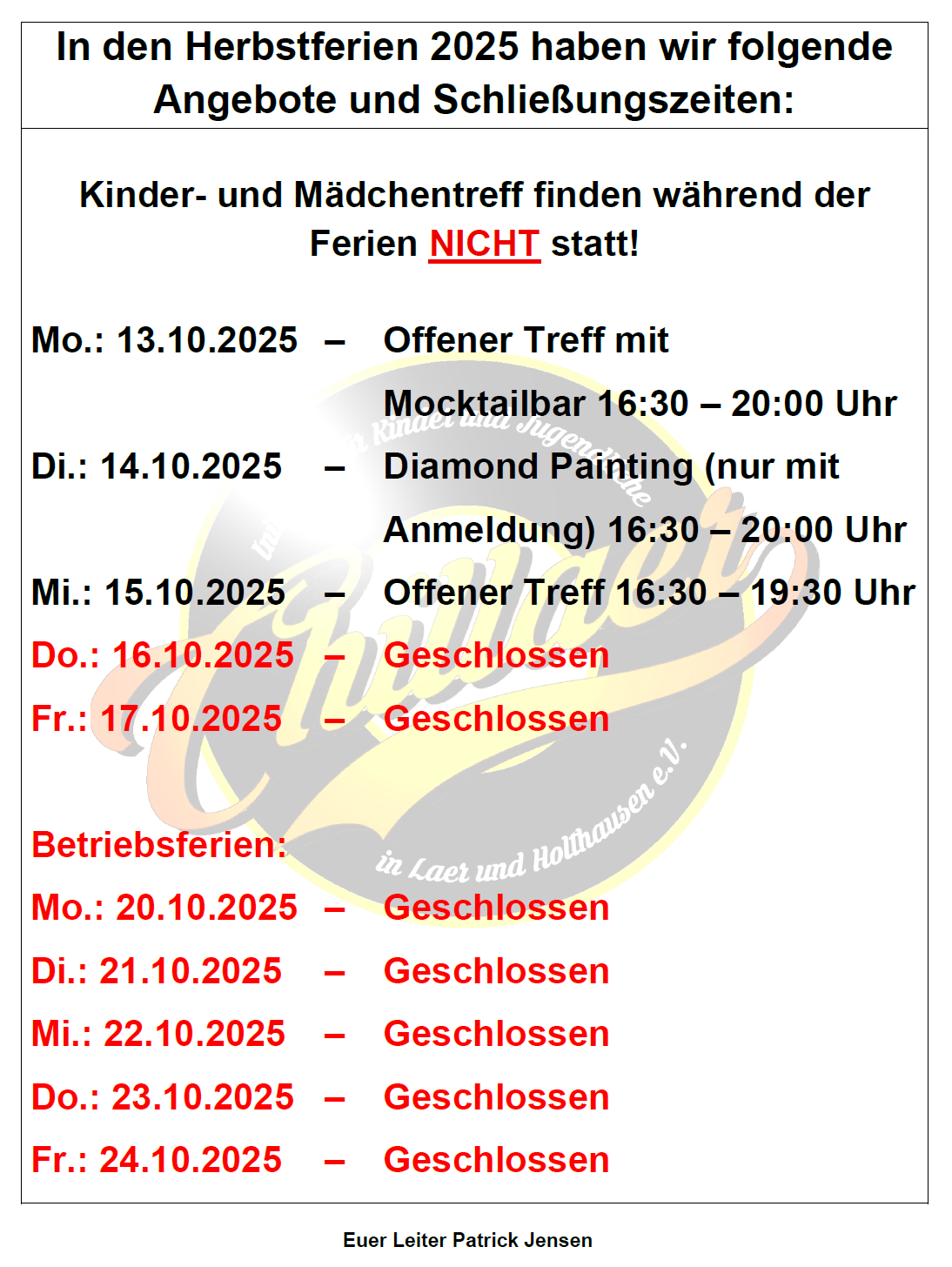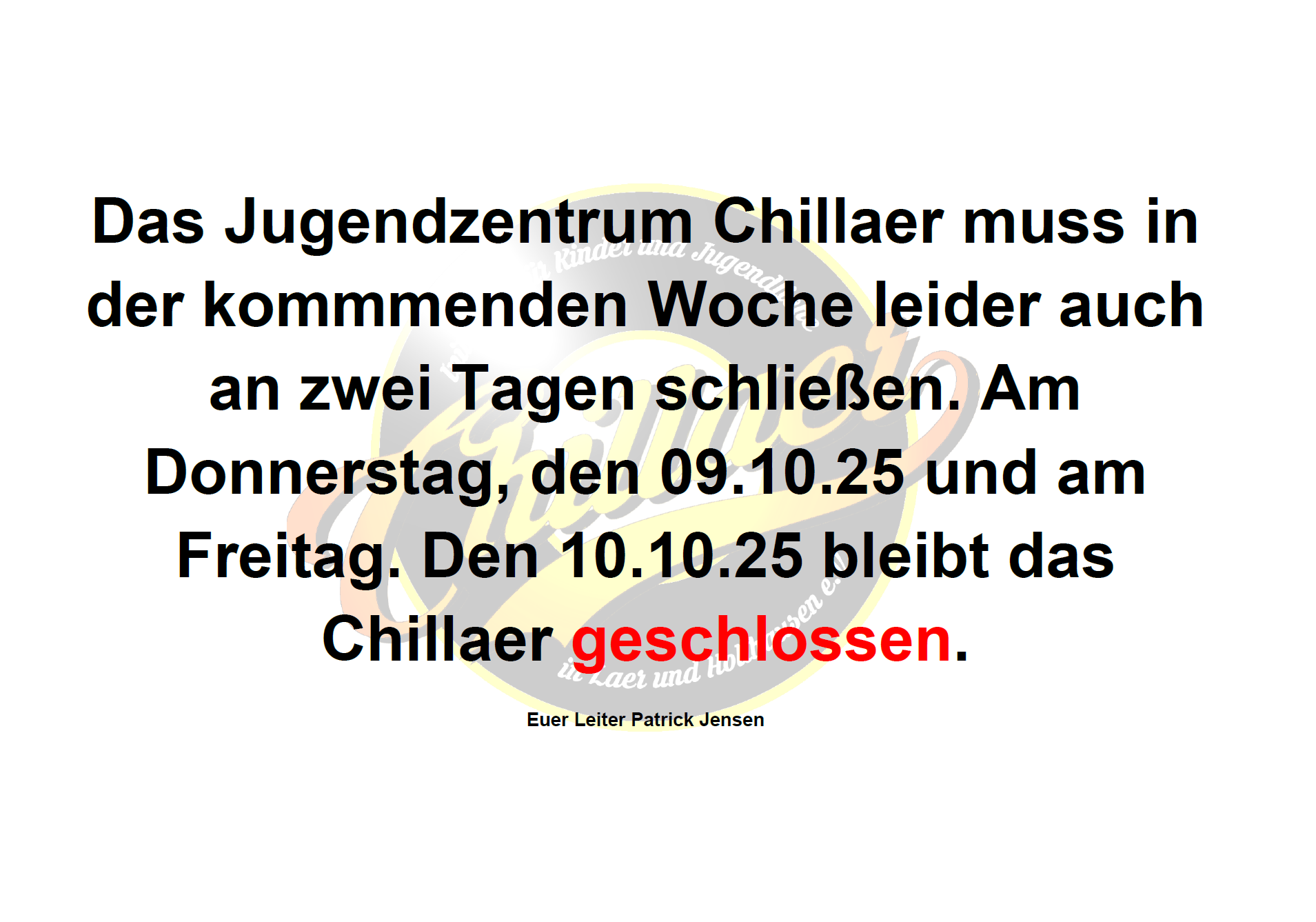 Leider fallen auch in der kommenden Woche zwei Öffnungen im Chillaer aus. Am 09.10.25 und am 10.10.25 bleibt das Chillaer leider geschlossen.