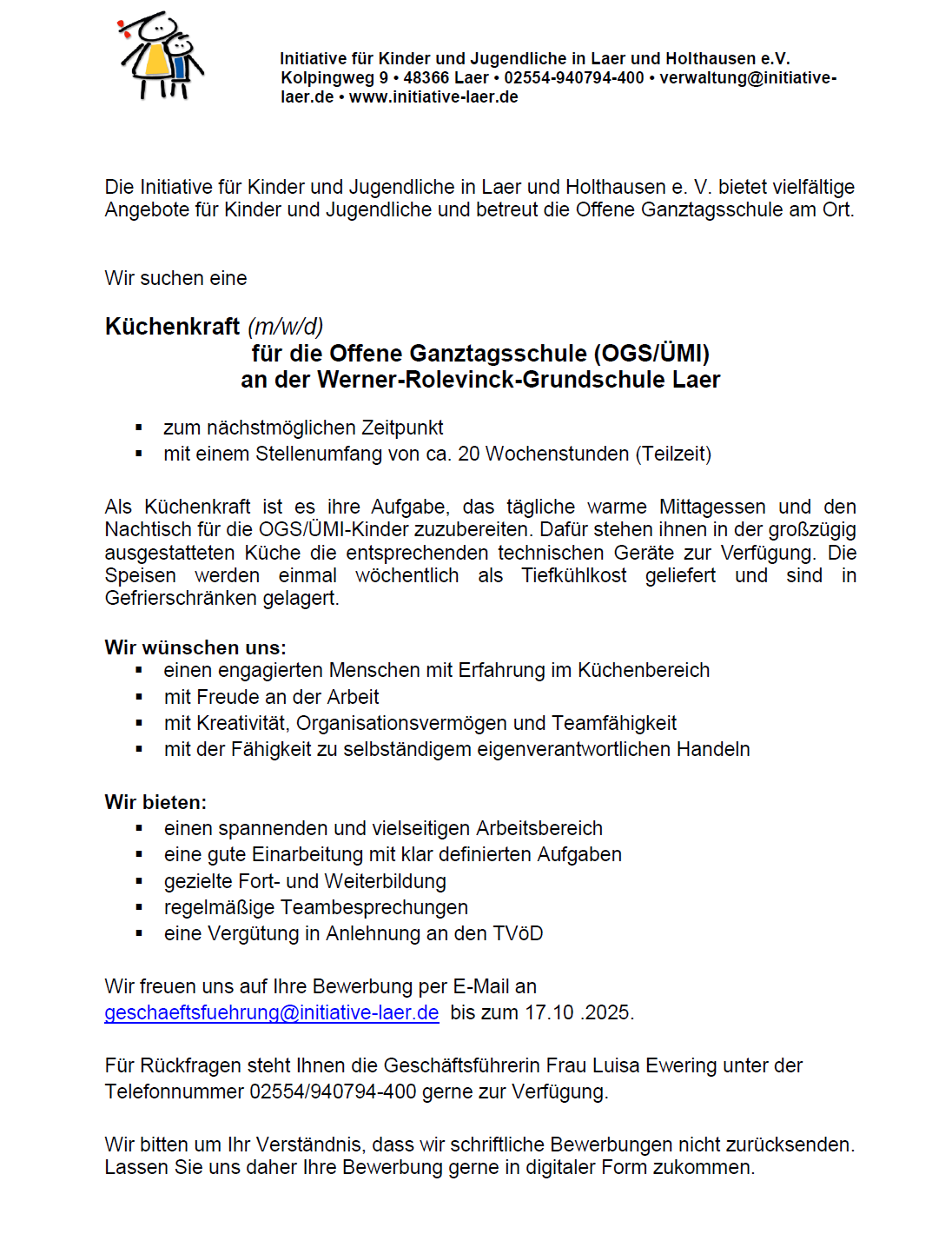 STELLENAUSSCHREIBUNGEN DER INITIATIVE FÜR KINDER UND JUGENDLICHE IN LAER UND HOLTHAUSEN E.V.