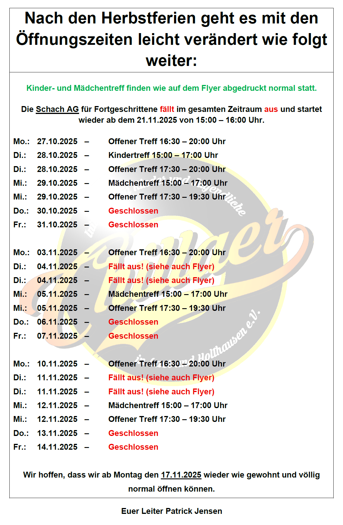 Leider fallen auch in der kommenden Woche zwei Öffnungen im Chillaer aus. Am 09.10.25 und am 10.10.25 bleibt das Chillaer leider geschlossen.