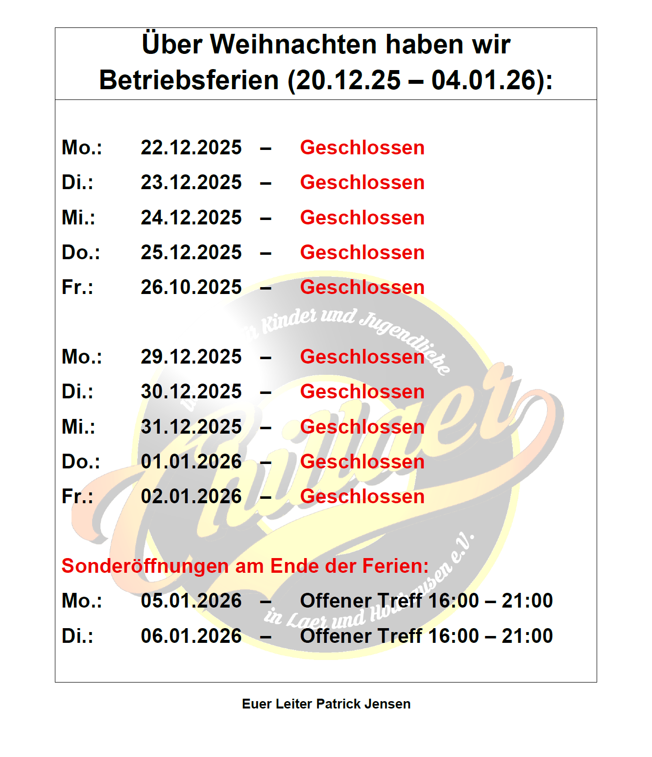 Das Programm für den Kindertreff im Fuchsbau wird jeweils kurz vorher angepasst über die What´s App-Gruppe kommuniziert. Dabei könnt ihr gerne über die What´s App-Gruppe mitentscheiden was gemacht werden soll. Auch könnt ihr euch dazu persönlich bei Neele und Vanessa oder per E-Mail melden.Sommerferienprogramm 2025